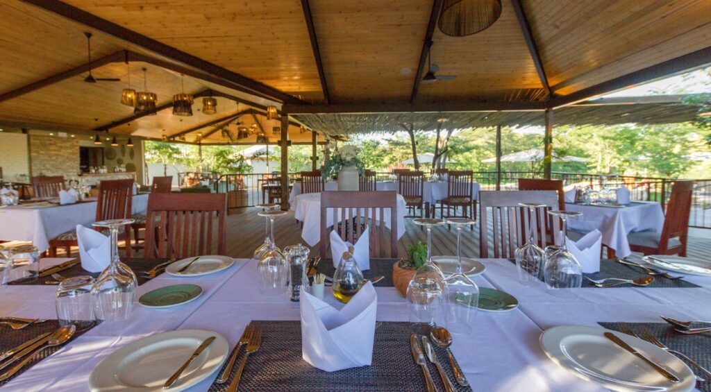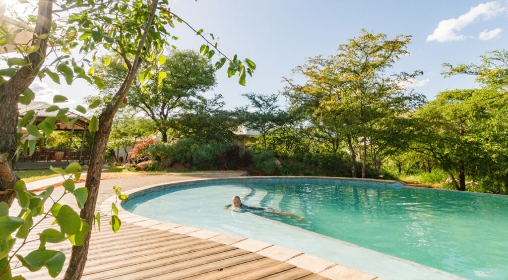The deck at Insika Lodge is a multifaceted structure as it links the kitchen area, the dining room and bar area, and the reception area of the lodge. A walkway then connects to this deck that runs down to the outdoor pool area and the game viewing deck located at the watering hole. For prime-time game viewing, you can’t really imagine a better scenario.